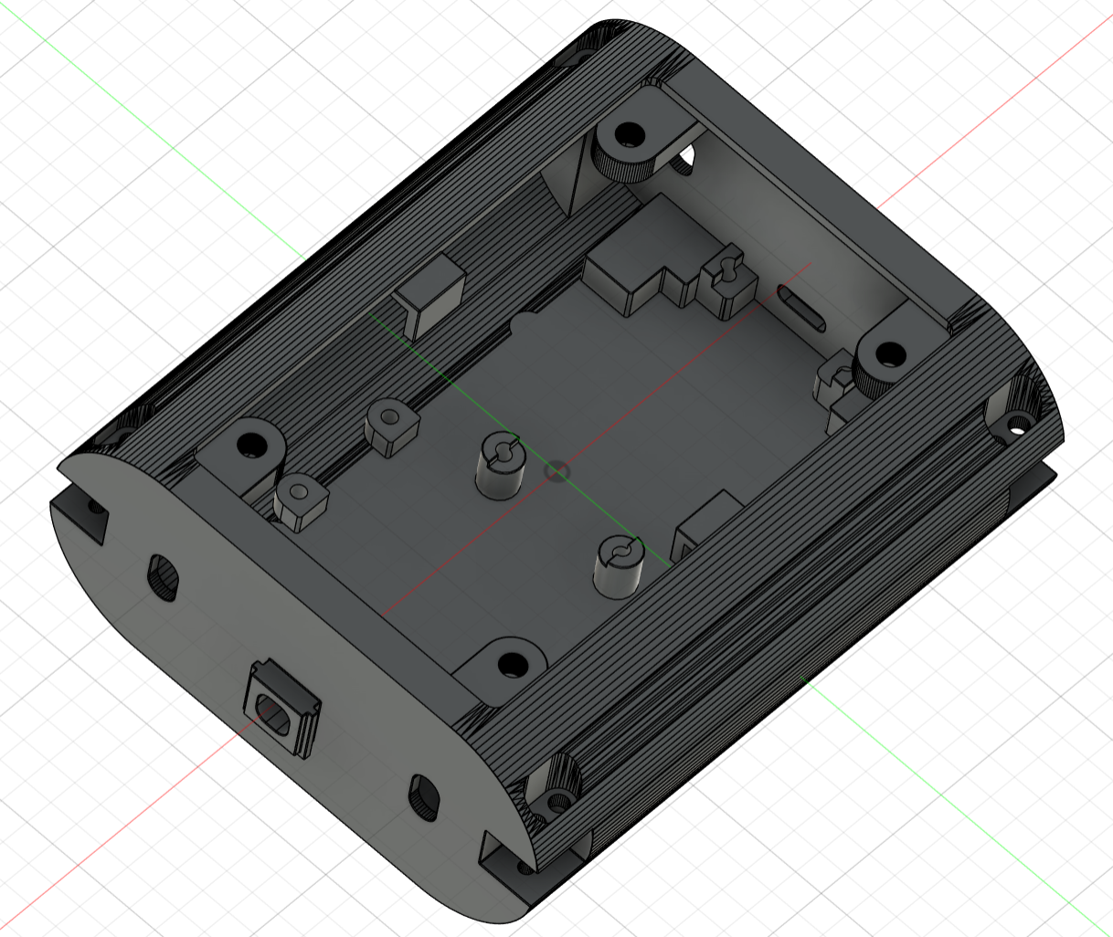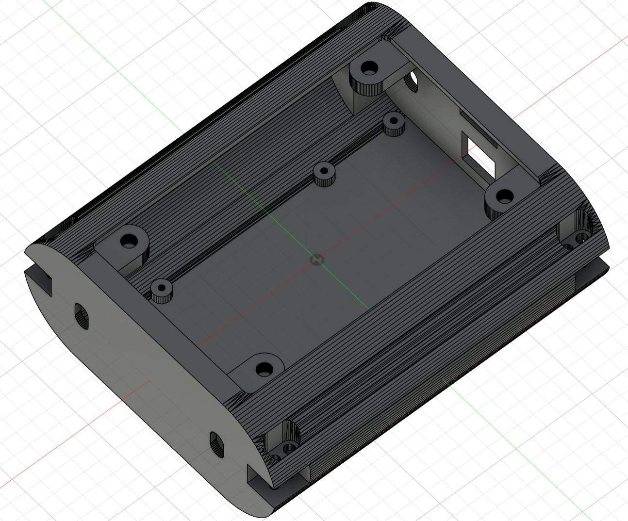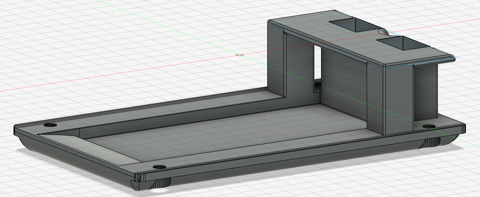 Additionally a 'shelf', with two extra recesses for small parts or cable management, was designed for a self-soldered board of relatively variable dimensions. To allow for insertion of the battery to remain possible beneath this structure, the opposite side of the indentation for the battery was flattened using filleting and chamfer operations.