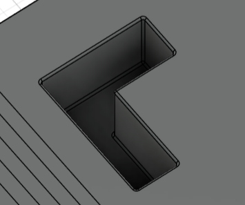 First were the receivers for the tray. In each corner of the flat top of the body slots were designed for counterparts on the bottom of the tray to fit into. These were sketched and then modeled into the inside of the body via extrusion operations.