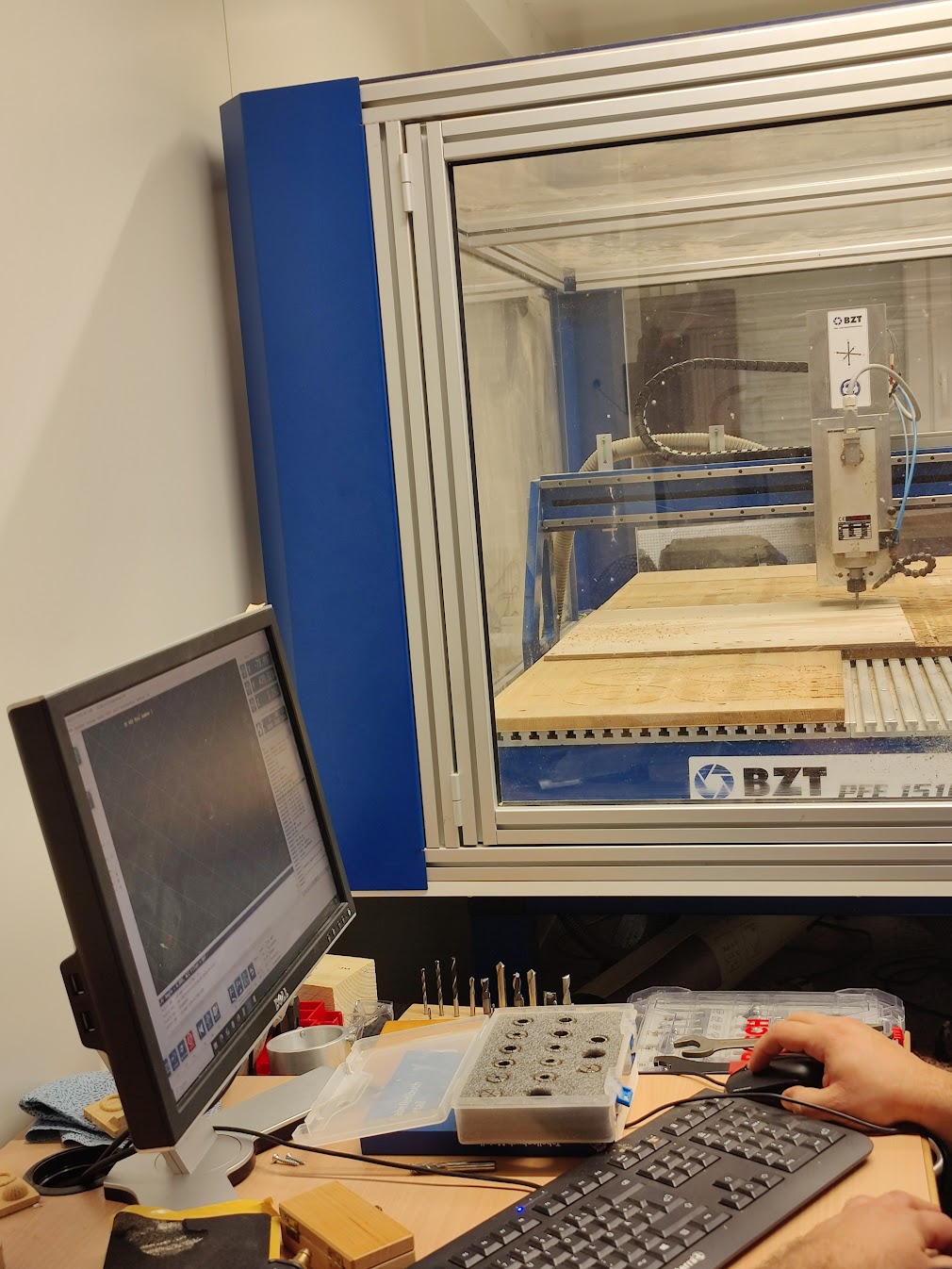 At first a BZT PFE 1510PX CNC machine was demonstrated, along with a brief explanation of G-Code, the programming language used for CNC machines. Next a hands-on introduction to a trotec Speedy 100 laser cutter, a Proxxon PD 400 lathe and a Proxxon FF 500 milling machine followed, qualifiyng us to use these machines on our own. Finally we were shown injection molding of a plastic into a resin-printed mold, where the importance of high quality molds became forcefully clear, due to the cast failing because of a too badly worn mold.